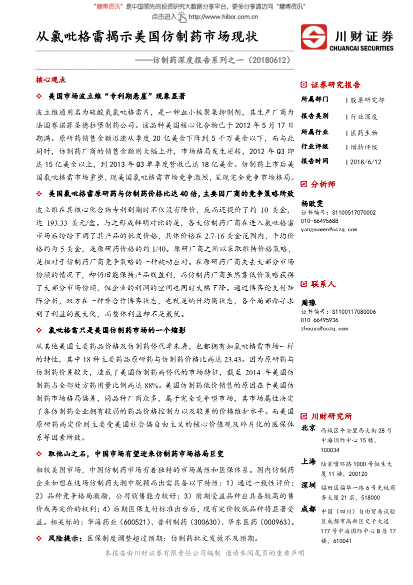 本报告由川财证券有限责任公司编制谨请参阅尾页的重要声明从氯吡格雷揭示美国仿制药市场现状证券研究报告所属部门股票研究部报告类别行业深度所属行业医药生物行业评级增持评级报告时间 2018/6/12 分析师杨欧雯证书编号:S02 联系人周豫证书编号:S06 川财研究所北京西城区平安里西大街28号中海国际中心15楼,100034 上海陆家嘴环路1000号恒生大厦11楼,200120 深圳福田区福华一路6号免税商务大厦21层,518000 成都中国(四川)自由贸易试验区成都市高新区交子大道177号中海国际中心B座17楼,610041 ——仿制药深度报告系列之一(20180612) 核心观点美国市场波立维“专利期悬崖”现象显著波立维通用名为硫酸氢氯吡格雷片,是一种血小板聚集抑制剂,其生产厂商为法国赛诺菲圣德拉堡制药公司。